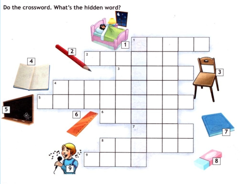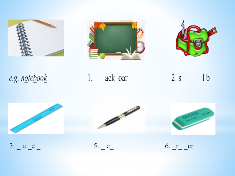 1) sleep2) pencil3) chair4) notebook5) blackboard6) ruler7) book8) eraser9) Sing SCHOOLBAG
