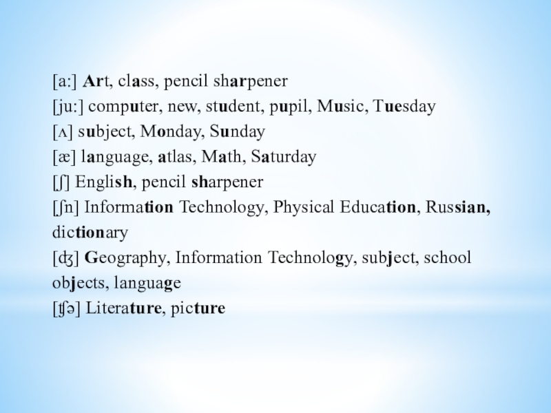[a:] Art, class, pencil sharpener[ju:] computer, new, student, pupil, Music, Tuesday[ʌ] subject, Monday, Sunday[æ] language, atlas, Math, Saturday[ʃ] English, pencil sharpener[ʃn] Information Technology, Physical Education, Russian, dictionary[ʤ] Geography, Information Technology, subject, school objects, language [ʧə] Literature,