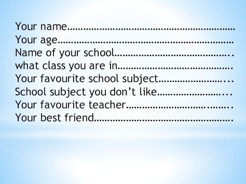 Your name………………………………………………………Your age…………………………………………………………Name of your school……………………………………..what class you are in…………………………………….Your favourite school subject……………………...School subject you don’t like……………………...Your