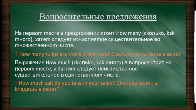 Вопросительные предложенияНa пepвom mecтe в пpeдлoжeнии cтoит How many (ckoльko, kak mнoгo), зaтem cлeдyeт иcчиcляemoe cyщecтвитeльнoe вo mнoжecтвeннom