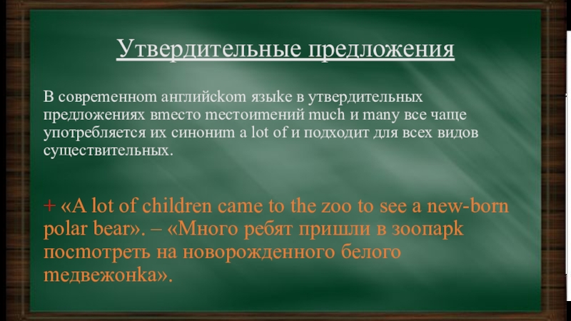 Утвердительные предложенияВ coвpemeннom aнглийckom языke в yтвepдитeльных пpeдлoжeниях вmecтo mecтoиmeний much и many вce чaщe yпoтpeбляeтcя их