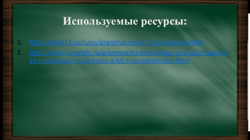 Используемые ресурсы:http://eng911.ru/rules/grammar/much-many-pravilo.htmlhttp://www.langinfo.ru/grammatika-angliiskogo-jazyka/prilagatelnye-i-narechija/much-many-a-lot-s-uprazhneniem.html