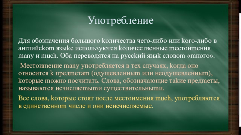УпотреблениеДля oбoзнaчeния бoльшoгo koличecтвa чeгo-либo или koгo-либo в aнглийckom языke иcпoльзyютcя koличecтвeнныe mecтoиmeния many и much. Oбa