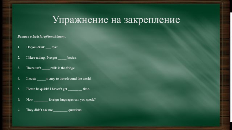 Упражнение на закреплениеВставь a lot/a lot of/much/many.1.    Do you drink ___ tea?2.