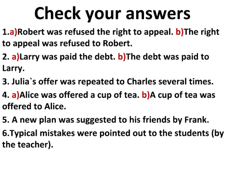 Check your answers1.a)Robert was refused the right to appeal. b)The right to appeal was refused to Robert.