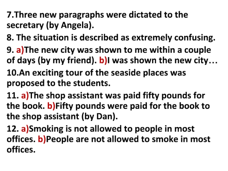 Слайд 137.Three new paragraphs were dictated to the secretary (by Angela).