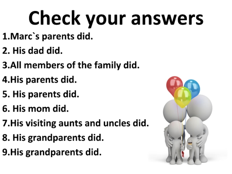 Check your answers1.Marc`s parents did.2. His dad did.3.All members of the family did.4.His parents did.5. His parents
