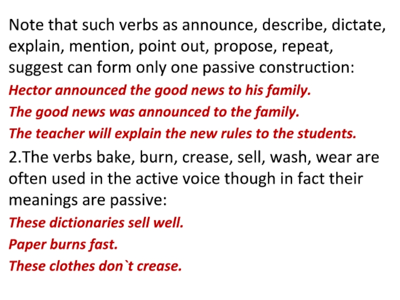 Слайд 10Note that such verbs as announce, describe, dictate, explain, mention, point