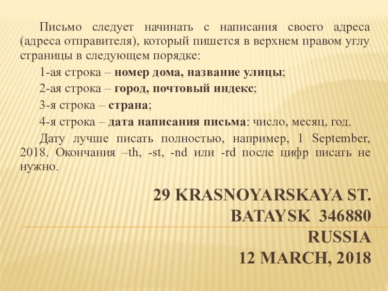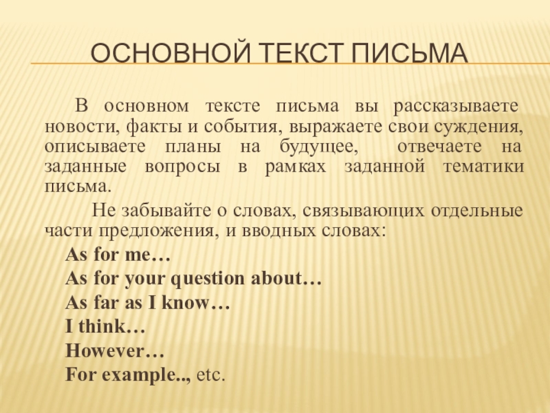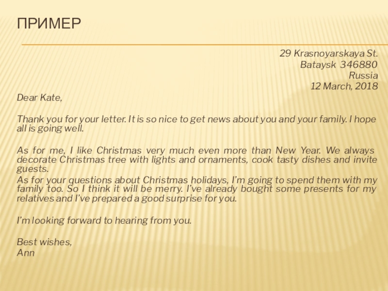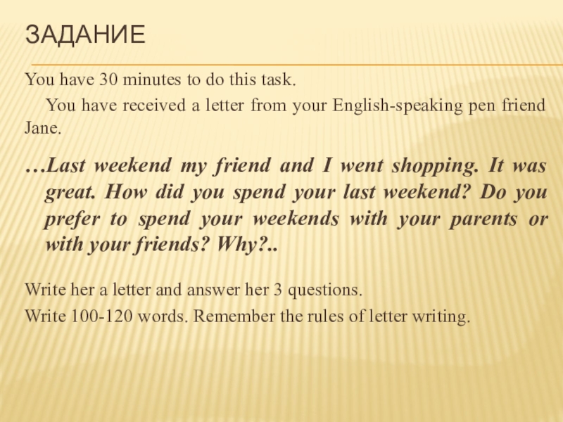 и события, выражаете свои суждения, описываете планы на будущее, отвечаете на заданные вопросы в рамках заданной тематики письма.