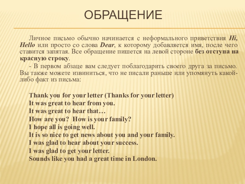 - В первом абзаце вам следует поблагодарить своего друга за письмо. Вы также можете извиниться, что не писали раньше или упомянуть какой-либо факт из письма: