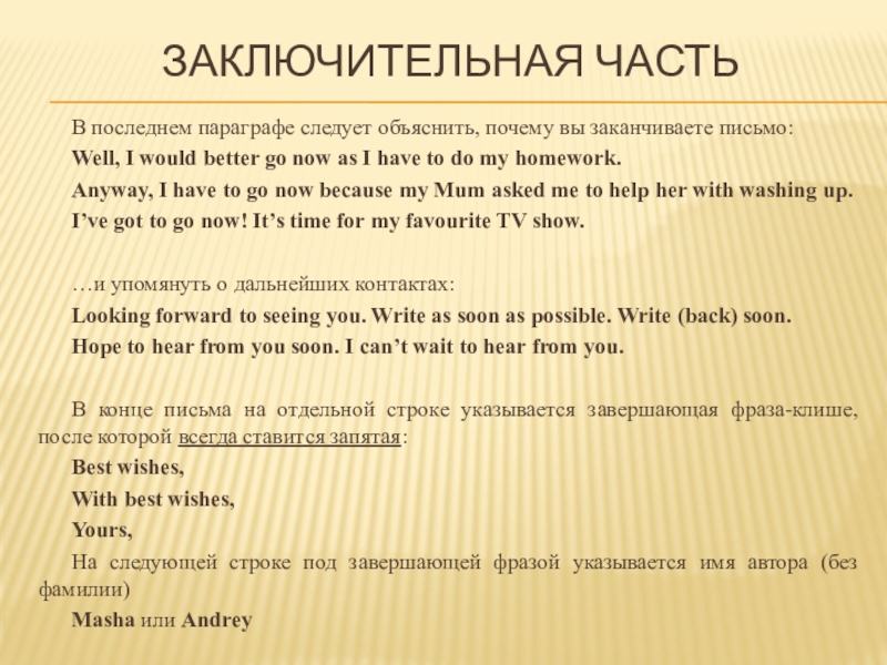 В последнем параграфе следует объяснить, почему вы заканчиваете письмо: