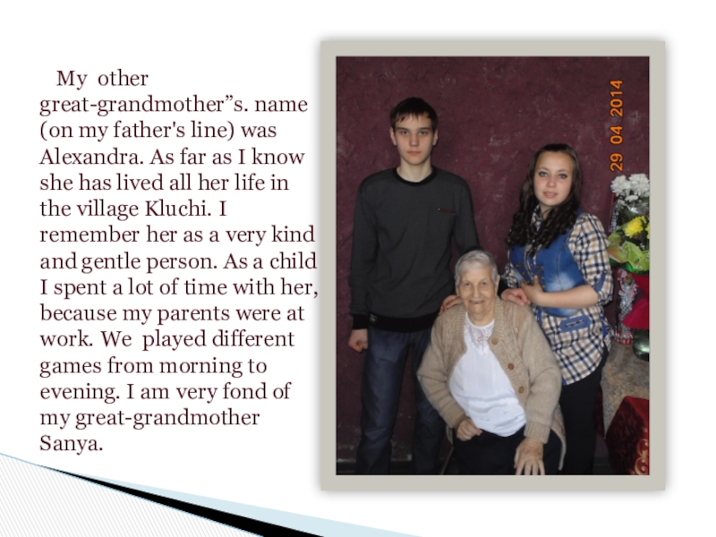 Alexandra. As far as I know she has lived all her life in the village Kluchi. I remember her as a very kind and gentle person. As a child I spent a lot of time with her, because my parents were at work. We played different games from morning to evening. I am very fond of my great-grandmother Sanya.