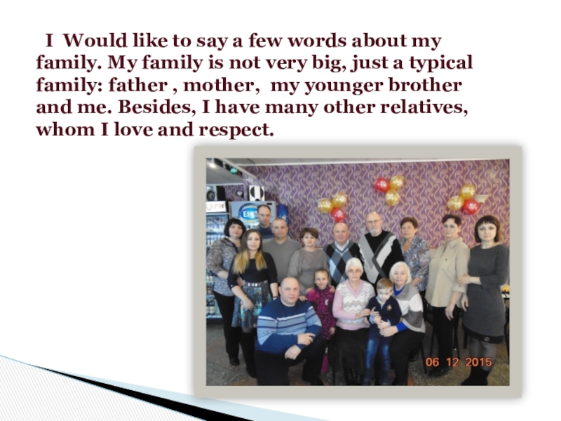 I Would like to say a few words about my family. My family is not very big, just a typical family: father , mother, my younger brother and me. Besides, I have many other relatives,