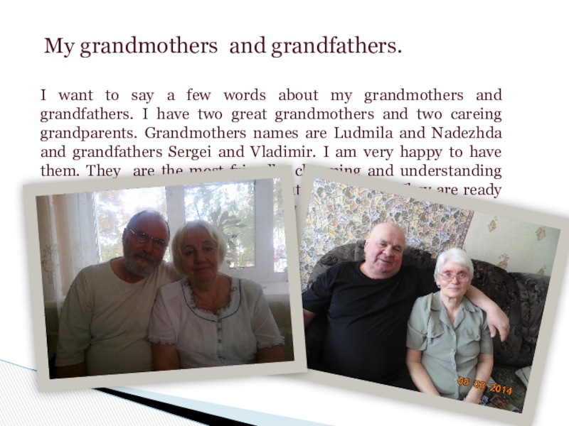 about my grandmothers and grandfathers. I have two great grandmothers and two careing grandparents. Grandmothers names are Ludmila and Nadezhda and grandfathers Sergei and Vladimir. I am very happy to have them. They are the most friendly, charming and understanding persons. They are very different, but very similar. They are ready to do everything for me , and I really like them.
