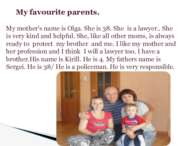 She is 38. She is a lawyer.. She is very kind and helpful. She, like all other moms, is always ready to protect my brother and me. I like my mother and her profession and I think I will a lawyer too. I have a brother.His name is Kirill. He is 4. My fathers name is Sergei. He is 38/ He is a policeman. He is very responsible.