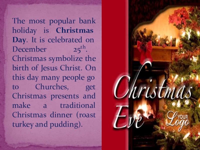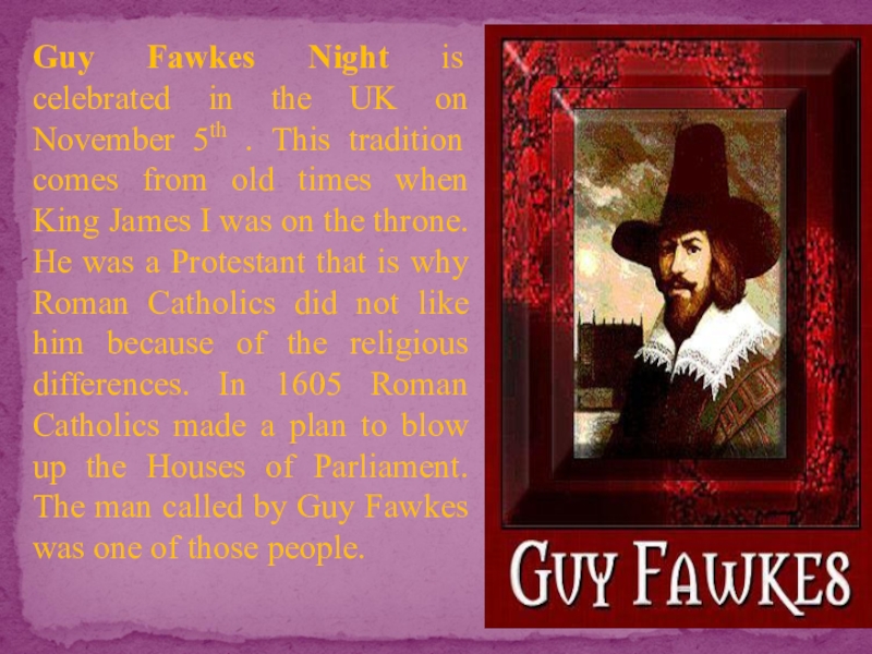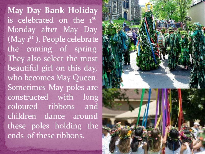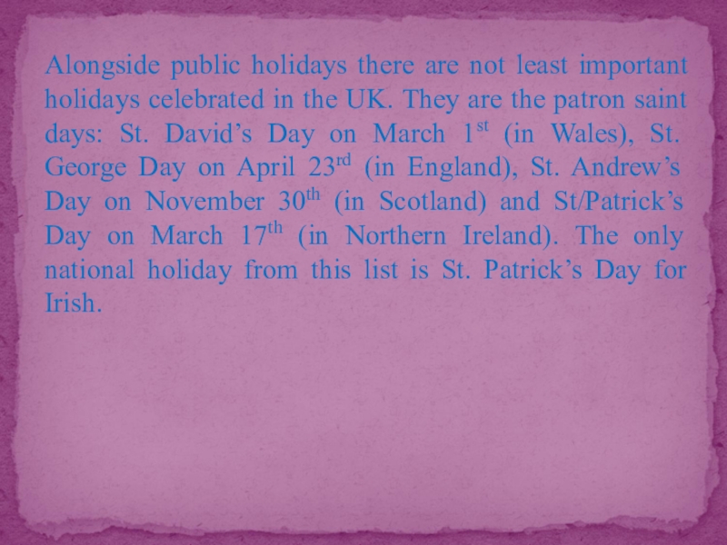 Besides bank holidays, there are also different festivals reflecting interesting traditions and customs. Among them are: St.Valentine’s Day, Shrove Tuesday (Pancake Day), April Fool’s Day, Mother’s Day (Mothering Sunday),Father’s Day, Halloween and Guy Fawkes Night.