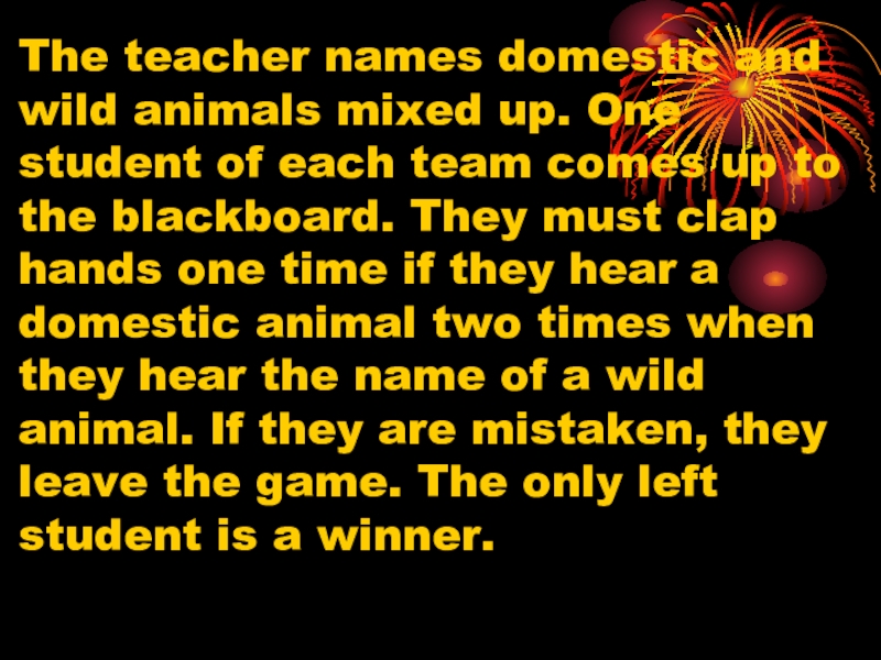 of each team comes up to the blackboard. They must clap hands one time if they hear a domestic animal two times when they hear the name of a wild animal. If they are mistaken, they leave the game. The only left student is a winner.