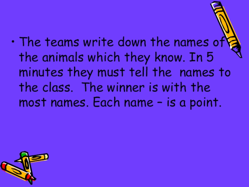 The teams write down the names of the animals which they know. In 5 minutes they must