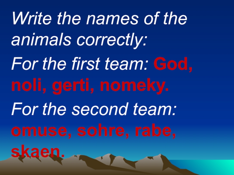 Write the names of the animals correctly:For the first team: God, noli, gerti, nomeky.For the second team: