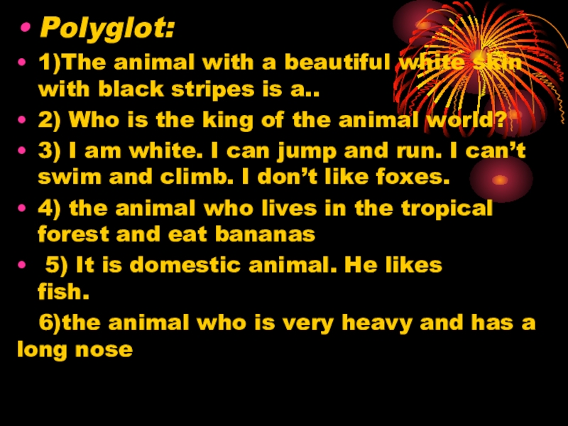 Polyglot: 1)The animal with a beautiful white skin with black stripes is a..         2) Who is the