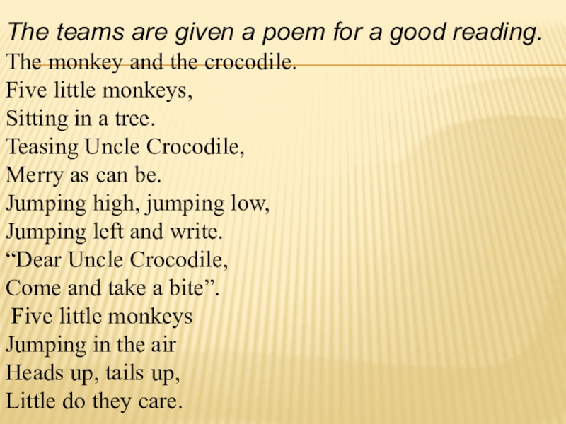 The teams are given a poem for a good reading. The monkey and the crocodile.Five little monkeys,Sitting
