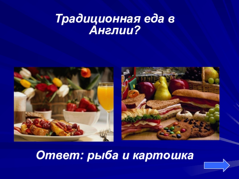 Традиционная еда в Англии?Ответ: рыба и картошка