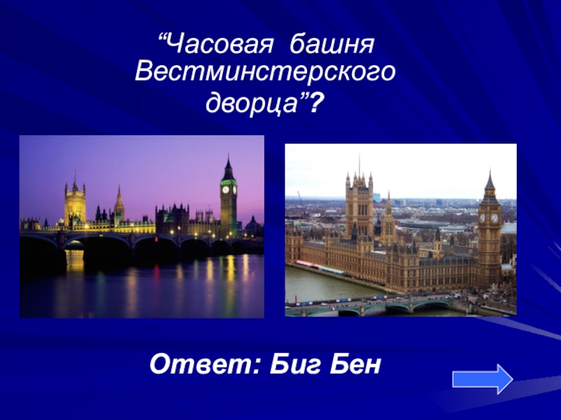 “Часовая башня Вестминстерского  дворца”?Ответ: Биг Бен
