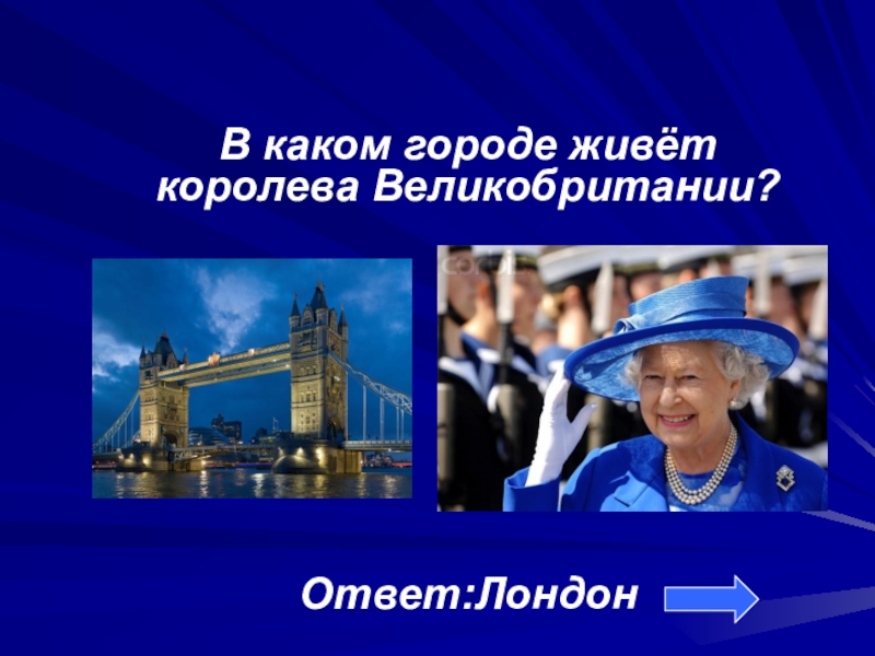 В каком городе живёт королева Великобритании?Ответ:Лондон