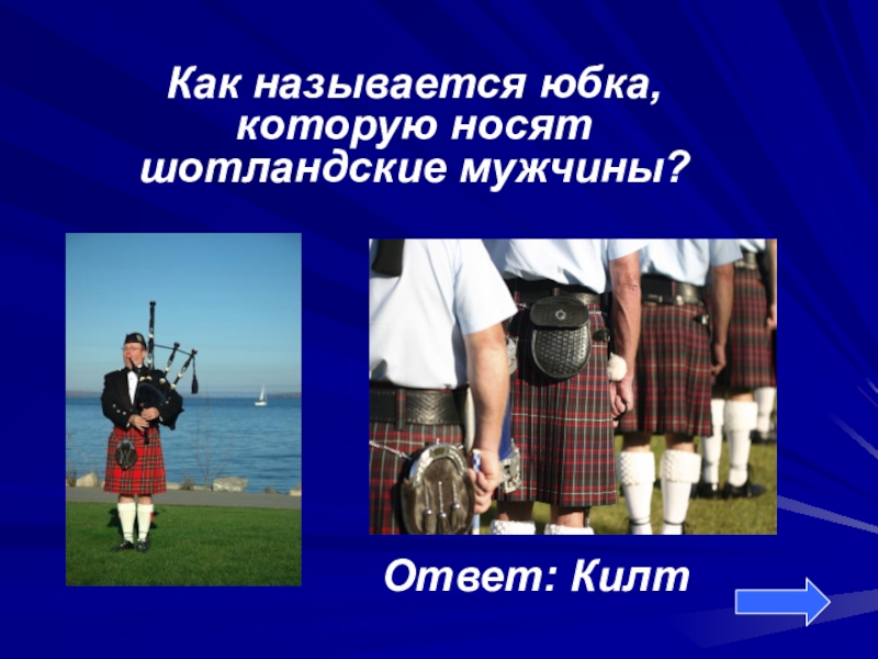Как называется юбка, которую носят шотландские мужчины?          Ответ: