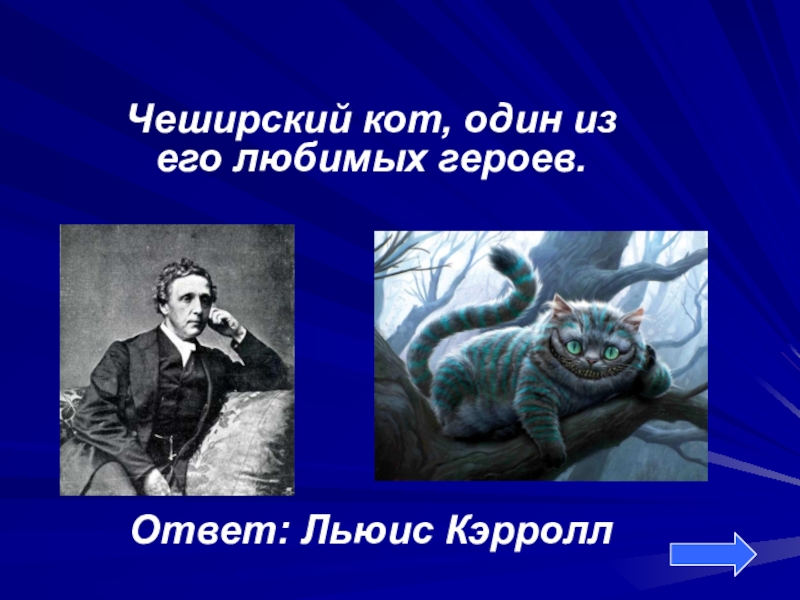 Чеширский кот, один из его любимых героев.Ответ: Льюис Кэрролл