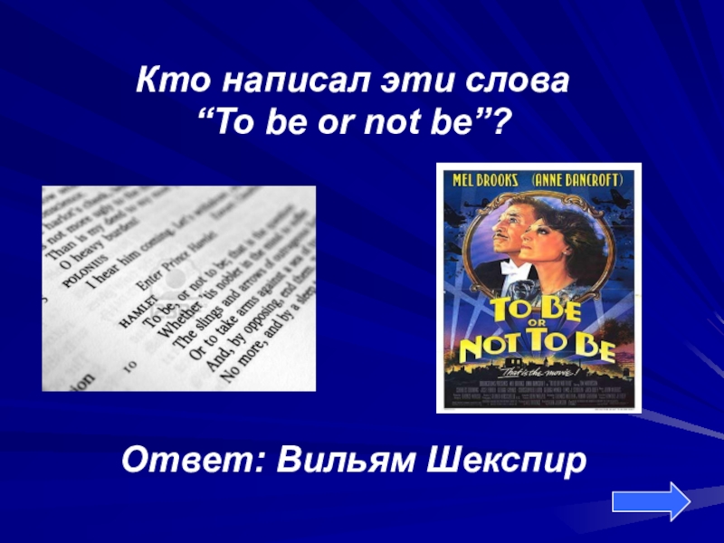 Кто написал эти слова“To be or not be”?Ответ: Вильям Шекспир