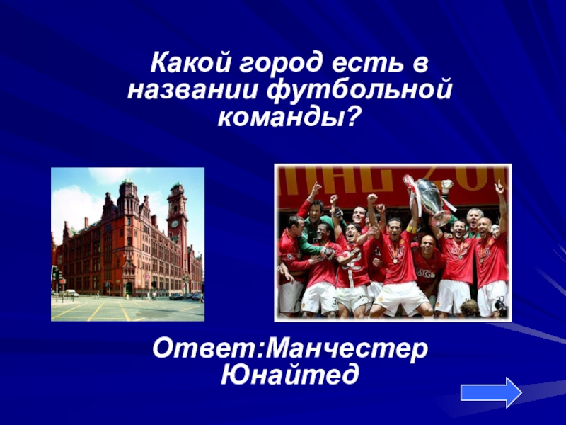 Какой город есть в названии футбольной команды?Ответ:Манчестер Юнайтед