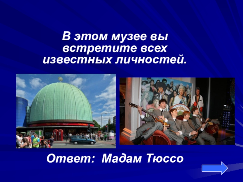 В этом музее вы встретите всех известных личностей.Ответ: Мадам Тюссо