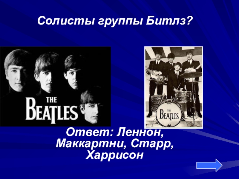 Солисты группы Битлз?Ответ: Леннон, Маккартни, Старр, Харрисон