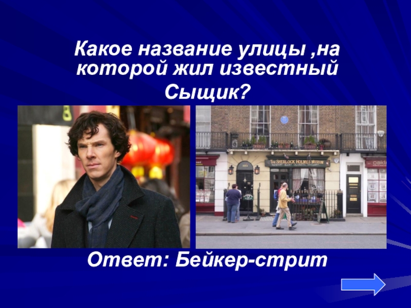 Какое название улицы ,на которой жил известный Сыщик?Ответ: Бейкер-стрит