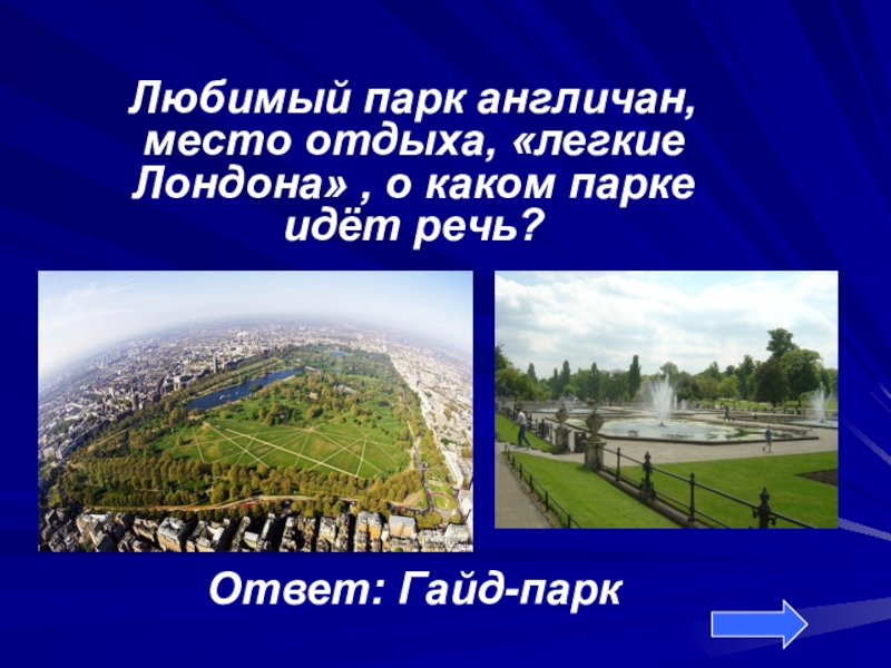 Любимый парк англичан, место отдыха, «легкие Лондона» , о каком парке идёт речь?Ответ: Гайд-парк