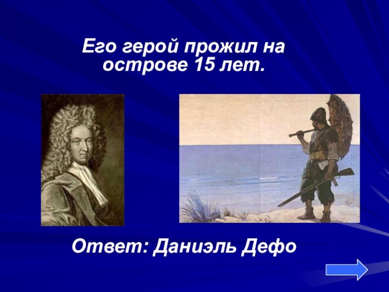 Его герой прожил на острове 15 лет.Ответ: Даниэль Дефо