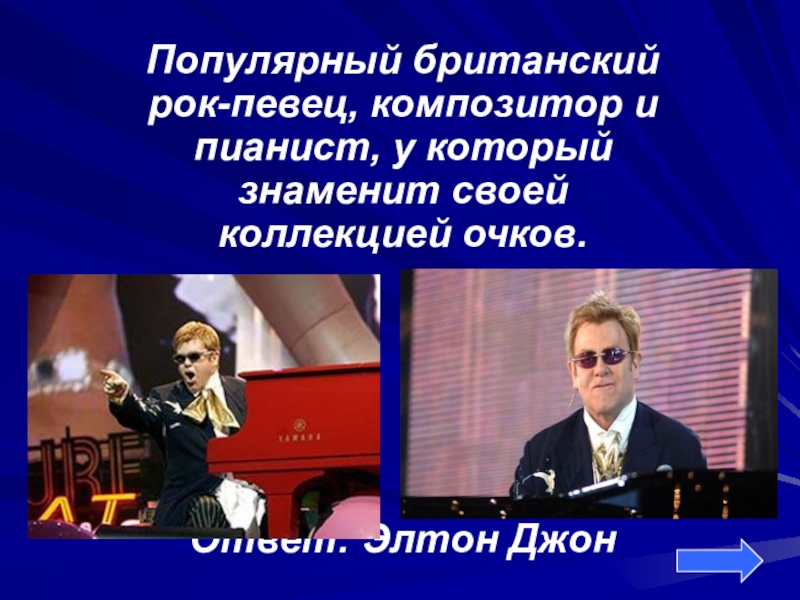Популярный британский рок-певец, композитор и пианист, у который знаменит своей коллекцией очков.Ответ: Элтон Джон