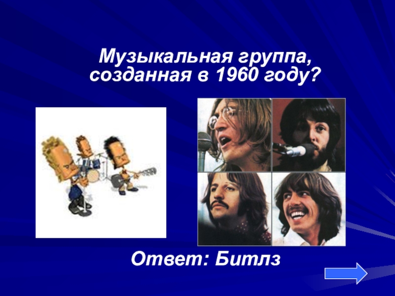 Музыкальная группа, созданная в 1960 году?Ответ: Битлз