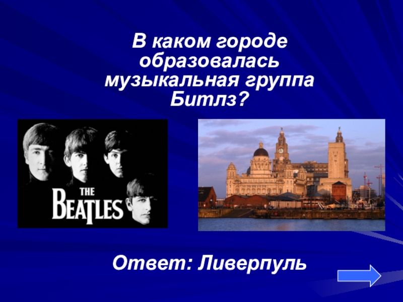В каком городе образовалась музыкальная группа Битлз?Ответ: Ливерпуль