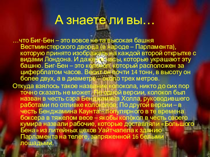 башня Вестминстерского дворца (в народе – Парламента), которую принято изображать на каждой второй открытке с видами Лондона. И даже не часы, которые украшают эту башню. Биг-Бен – это колокол, который расположен за циферблатом часов. Весит он почти 14 тонн, в высоту он более двух, а в диаметре – около трех метров.