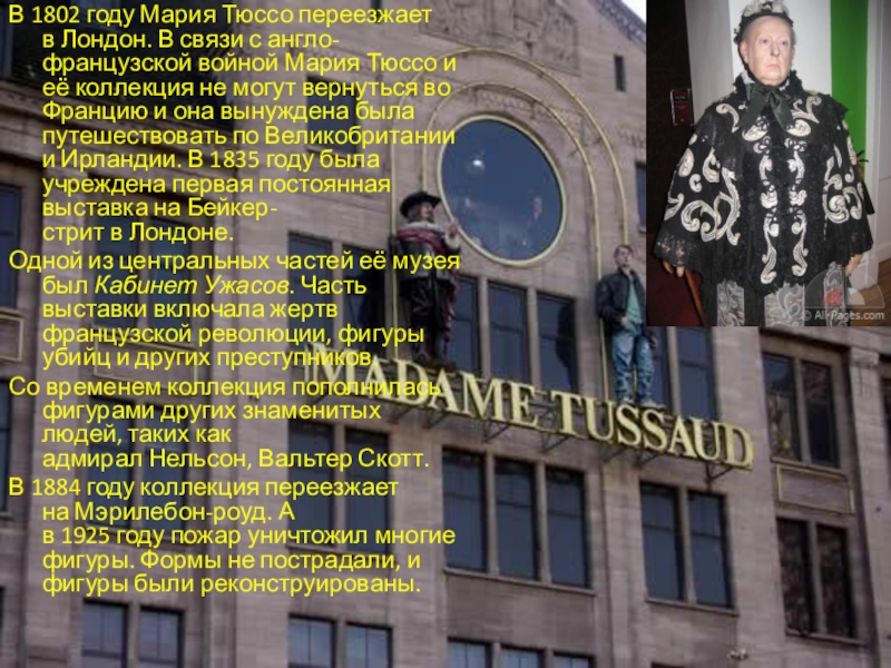 Слайд 14В 1802 году Мария Тюссо переезжает в Лондон. В связи с англо-французской войной Мария Тюссо