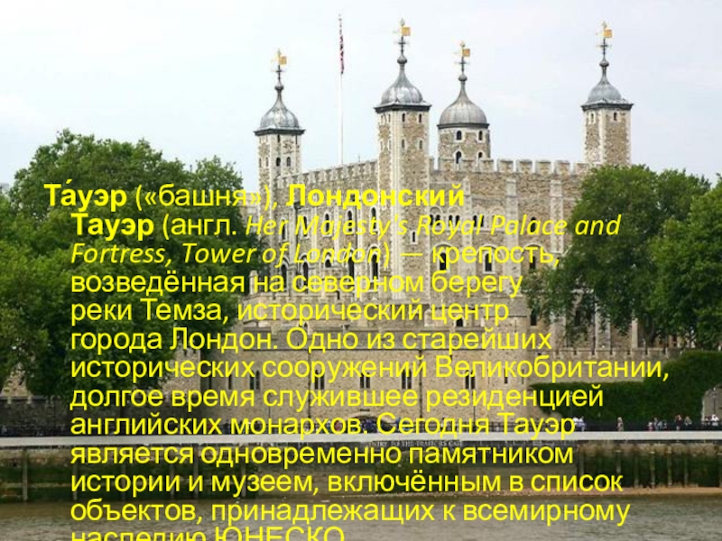 Слайд 11Та́уэр («башня»), Лондонский Тауэр (англ. Her Majesty's Royal Palace and Fortress, Tower of London) — крепость, возведённая