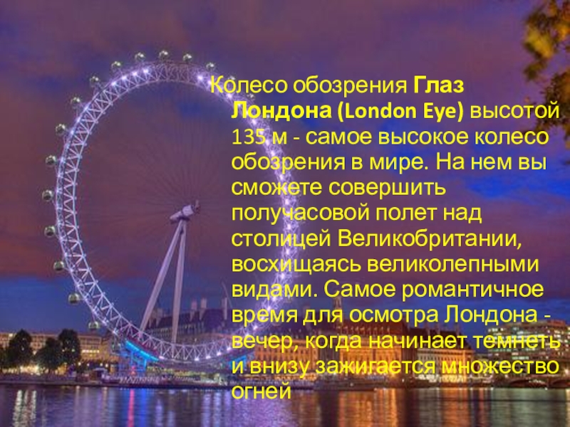 обозрения в мире. На нем вы сможете совершить получасовой полет над столицей Великобритании, восхищаясь великолепными видами. Самое романтичное время для осмотра Лондона - вечер, когда начинает темнеть и внизу зажигается множество огней