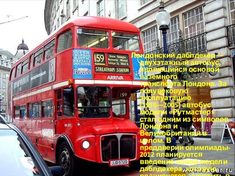 Слайд 13Лондонский даблдекер — двухэтажный автобус, являющийся основой наземного транспорта Лондона. За полувековую эксплуатацию