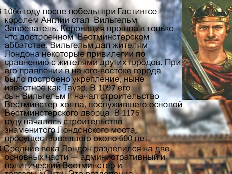 Слайд 4В 1066 году после победы при Гастингсе королем Англии стал Вильгельм Завоеватель. Коронация прошла
