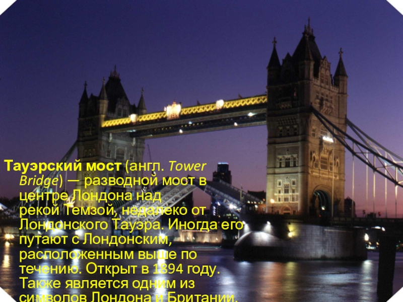 Слайд 12Тауэрский мост (англ. Tower Bridge) — разводной мост в центре Лондона над рекой Темзой, недалеко от Лондонского Тауэра. Иногда его