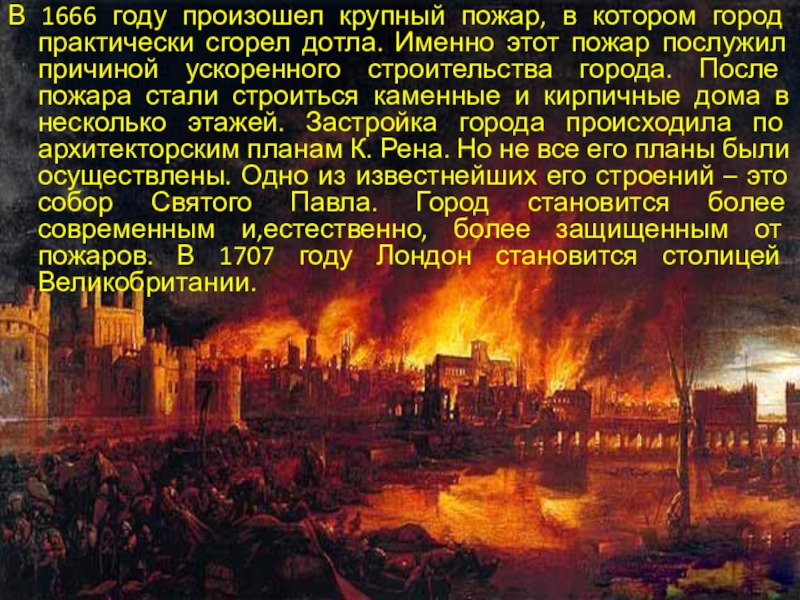 дотла. Именно этот пожар послужил причиной ускоренного строительства города. После пожара стали строиться каменные и кирпичные дома в несколько этажей. Застройка города происходила по архитекторским планам К. Рена. Но не все его планы были осуществлены. Одно из известнейших его строений – это собор Святого Павла. Город становится более современным и,естественно, более защищенным от пожаров. В 1707 году Лондон становится столицей Великобритании.
