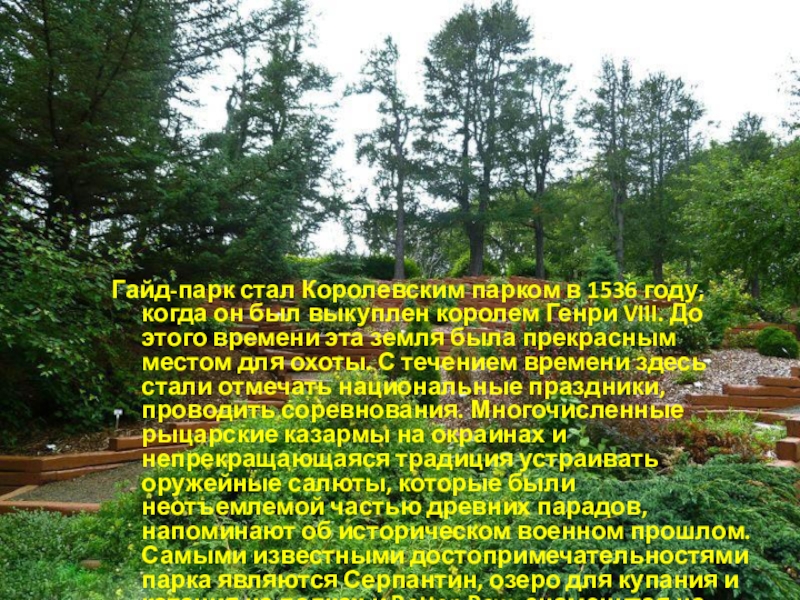Слайд 10Гайд-парк стал Королевским парком в 1536 году, когда он был выкуплен