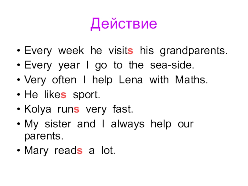 ДействиеEvery week he visits his grandparents.Every year I go to the sea-side.Very often I help Lena with